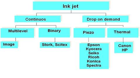 噴墨技術(shù)分為連續(xù)噴墨和按需噴墨(DOD)兩種,前者目前只用在柯達(dá)的數(shù)字印刷機(jī)上,市場上的絕大部分噴墨打印機(jī)都屬于按需噴墨技術(shù),按需噴墨又分為壓電和熱發(fā)泡兩類,熱發(fā)泡噴頭廉價、精度高,但其缺點也是顯而易見的:噴頭壽命短、只適用水性墨水,因之主要用于家庭和辦公室的紙張打??;而壓電噴墨是利用陶瓷加上電壓后會變形的原理,直接將電壓轉(zhuǎn)換為機(jī)械壓力,工作在常溫下,也無需溶解在水中的氧氣幫忙,所以不但噴頭壽命長,而且可以適用各種類型溶劑所生產(chǎn)的墨水。